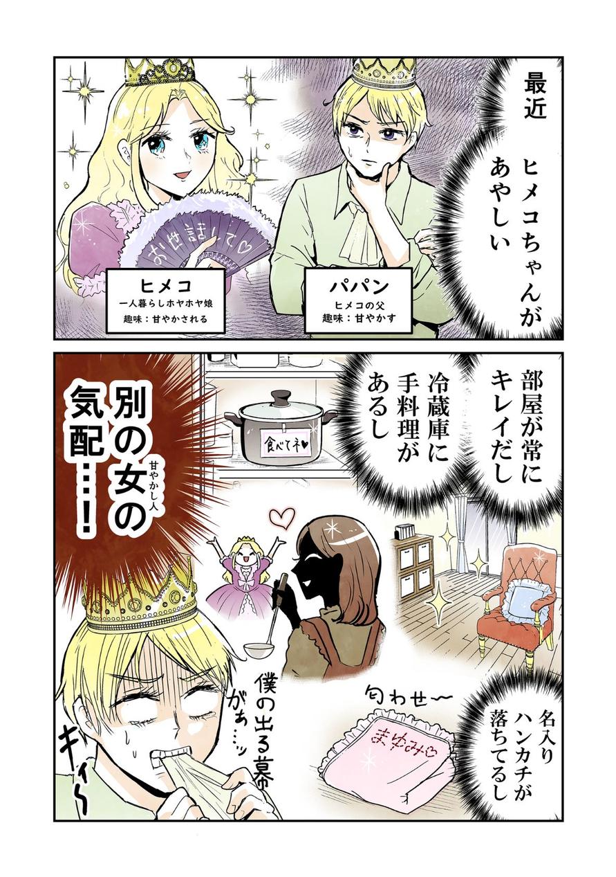 「最近、ヒメコちゃんがあやしい」と思い悩むパパン。甘やかされるのが趣味のヒメコが、自分以外の誰かに甘やかされているようで……。キィー!とハンカチを噛み締めるパパンは……。続きはこちら