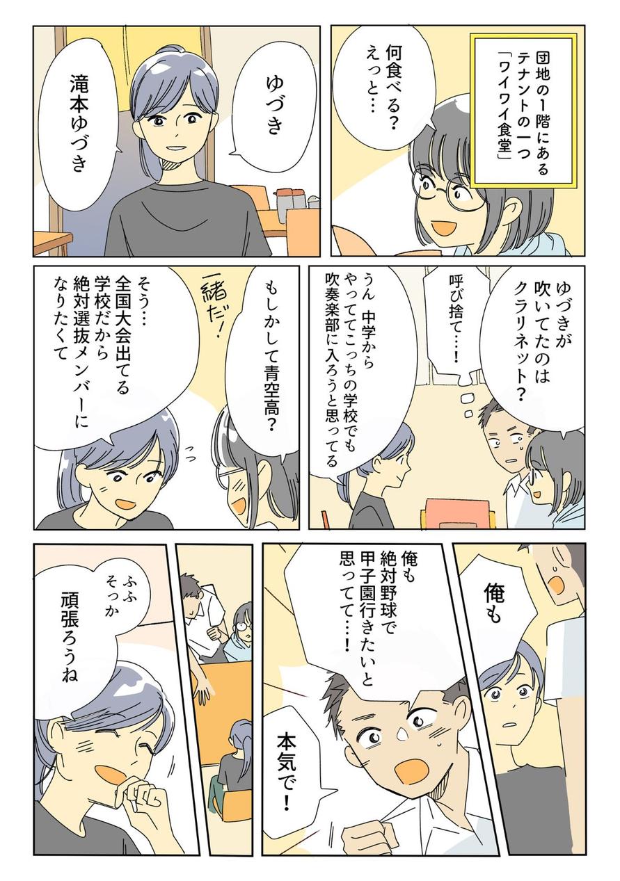 けんとと幼馴染のはなは、団地内の食堂での食事をきっかけにゆづきと仲よくなりました。