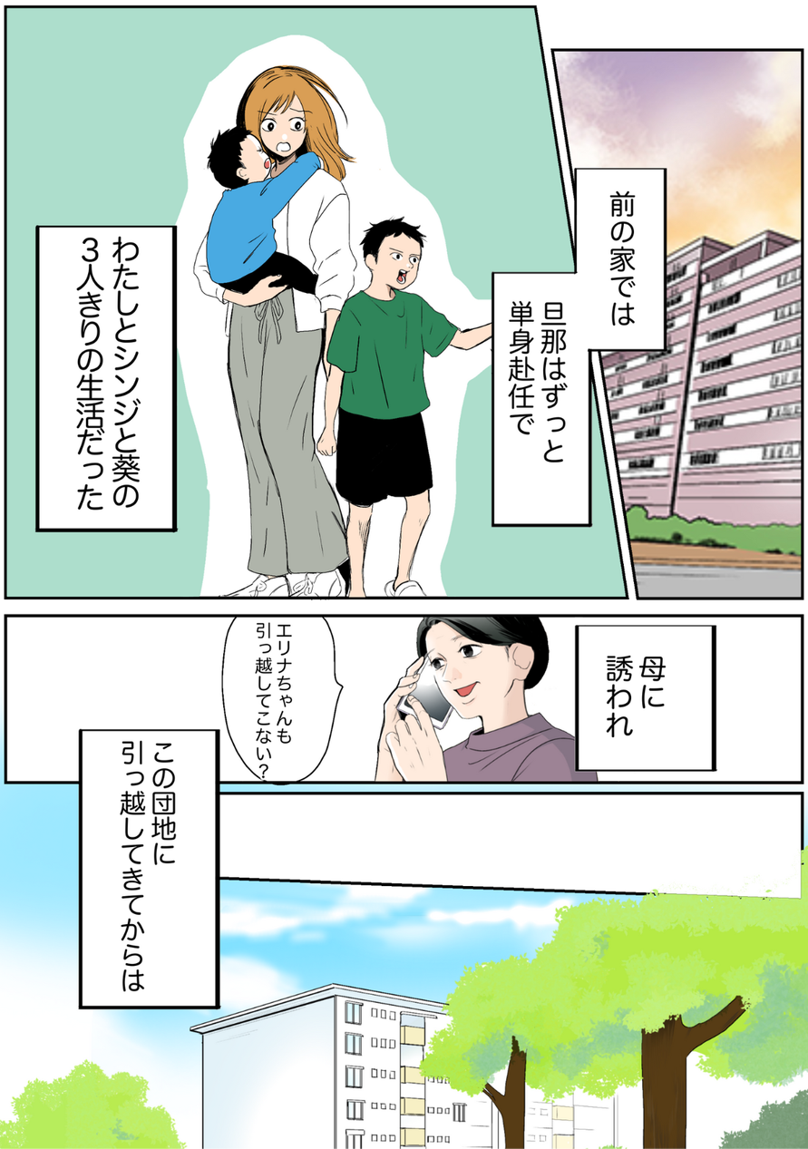 夫は単身赴任で、シンジと葵と3人で生活をするエリナ。母に誘われ団地に引っ越してきて1ヶ月。少しずつ団地の暮らしに慣れてきました。