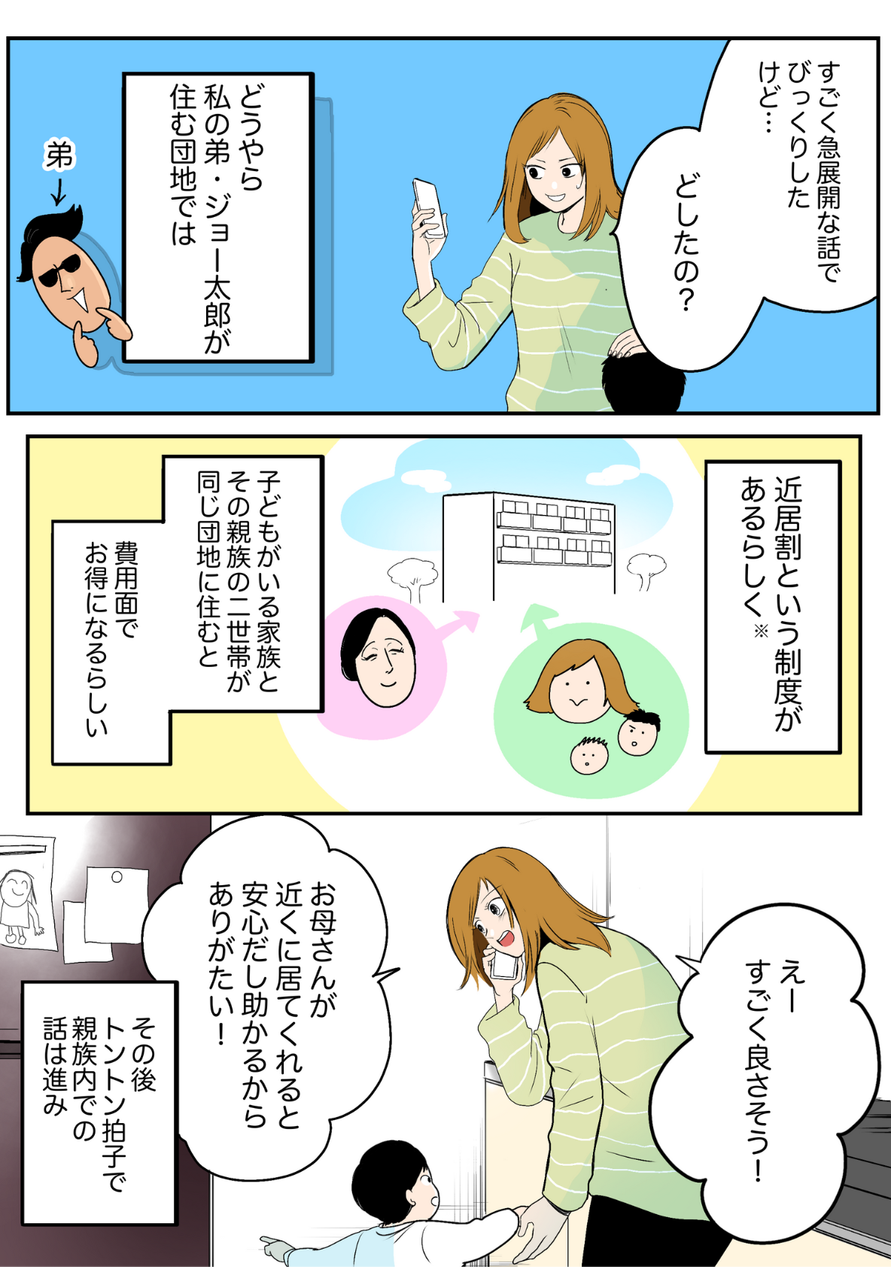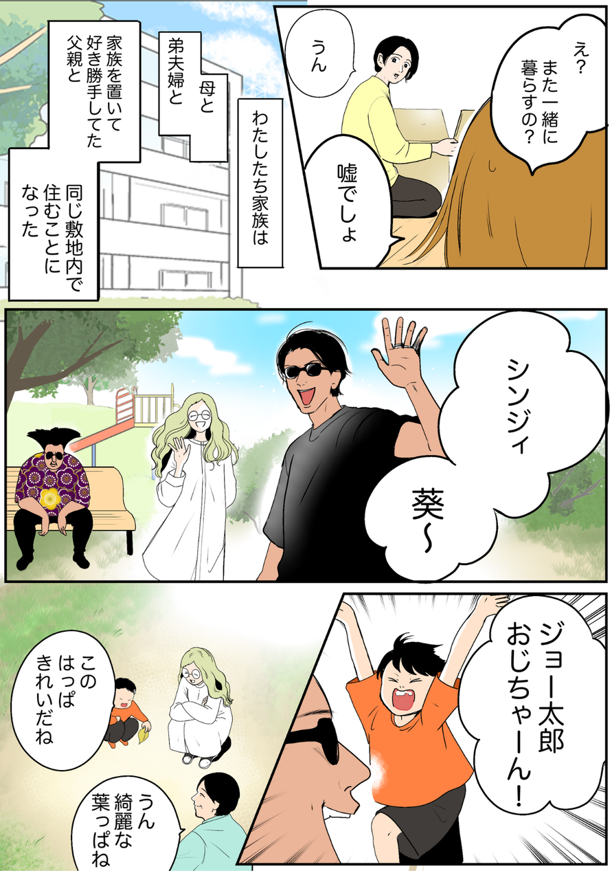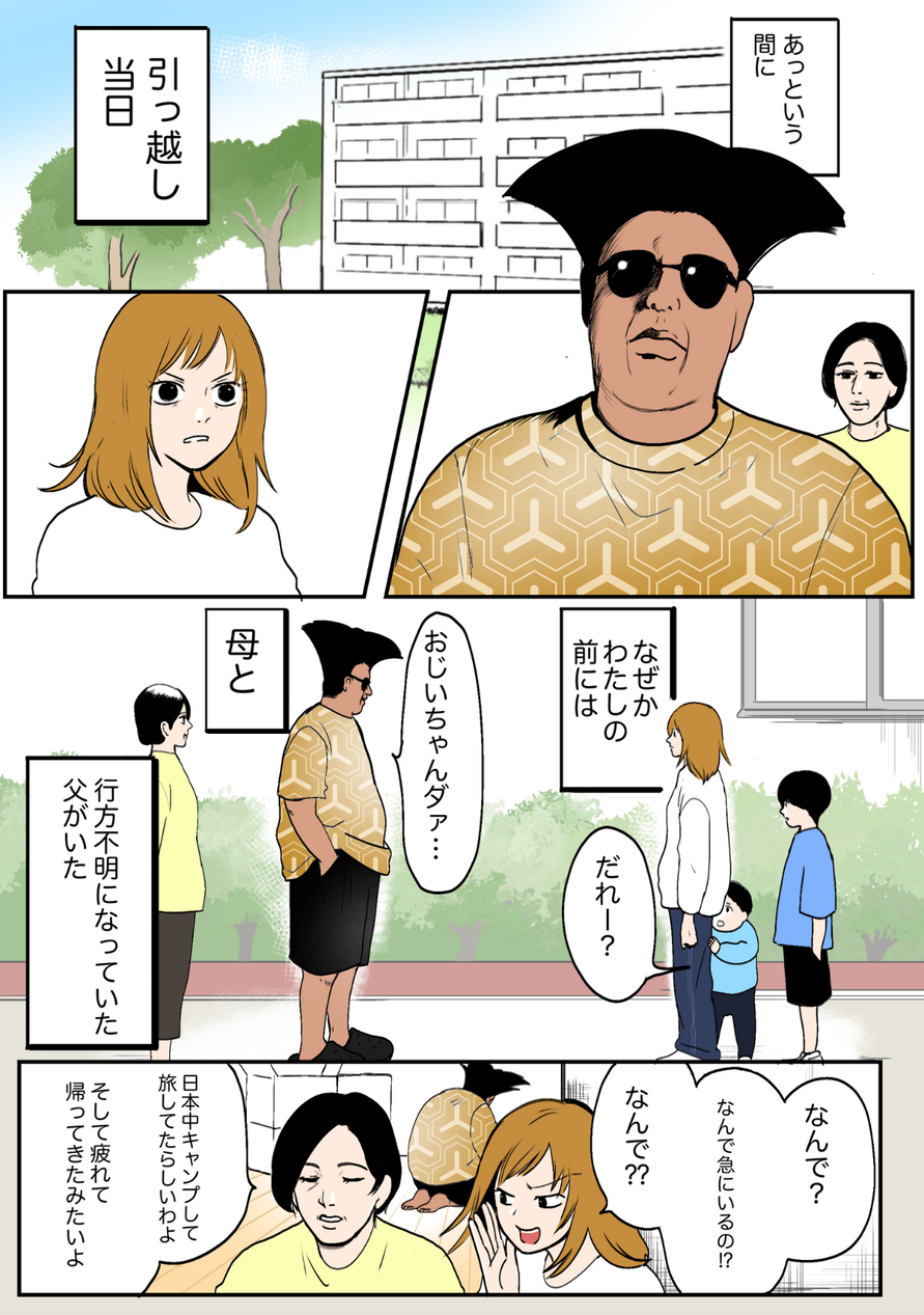日本中をキャンプして好き勝手していた父が、引っ越し当日、突然現れたら驚きますよね! 母と弟夫婦、そして父も同じ団地の敷地内に住むことになり、にぎやかな日々が始まりそうです。