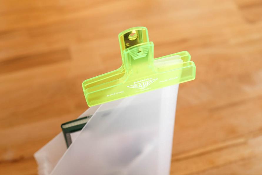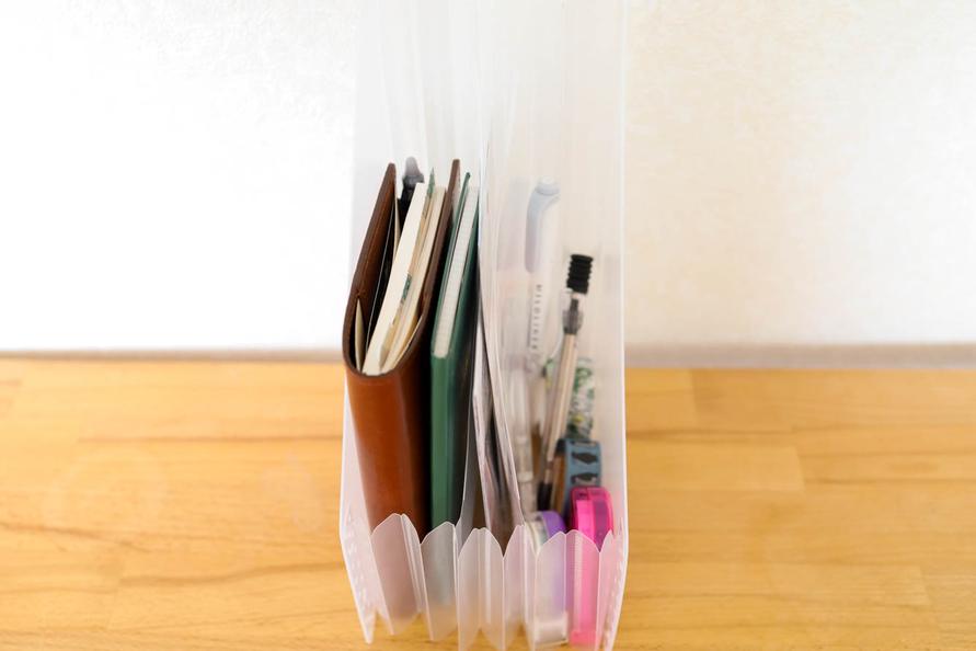 上が閉じるわけではないので、持ち運びにはやや不向きかな?と思いつつ、クリップやゴムひもなどでまとめれば不可能ではなさそう。
