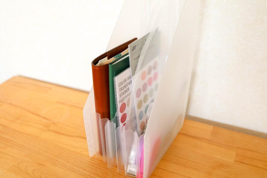 私は家での使用メインですが、普段はこのまま収納ラックなどに入れておいて、手帳を書くときにこのファイルごとデスクに移動という運用に。