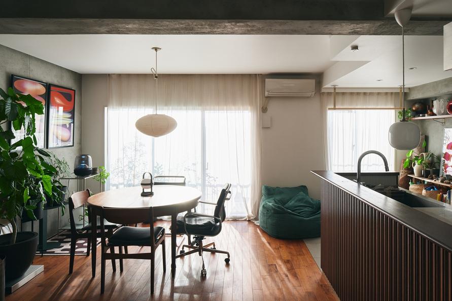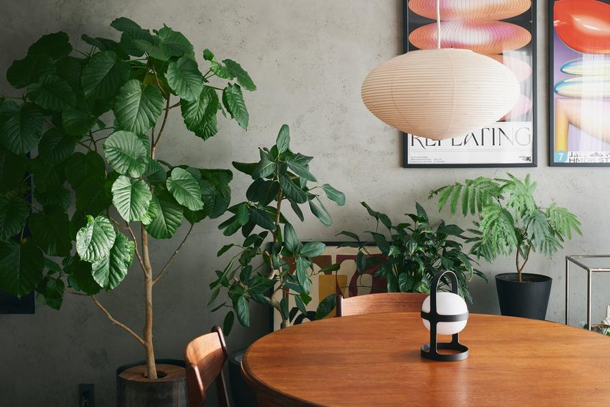 モルタルの壁に無垢材のフローリング、そしてシンプルでモダンな空間に、飾られたアートや観葉植物、ミッドセンチュリーなインテリアが溶け込む。