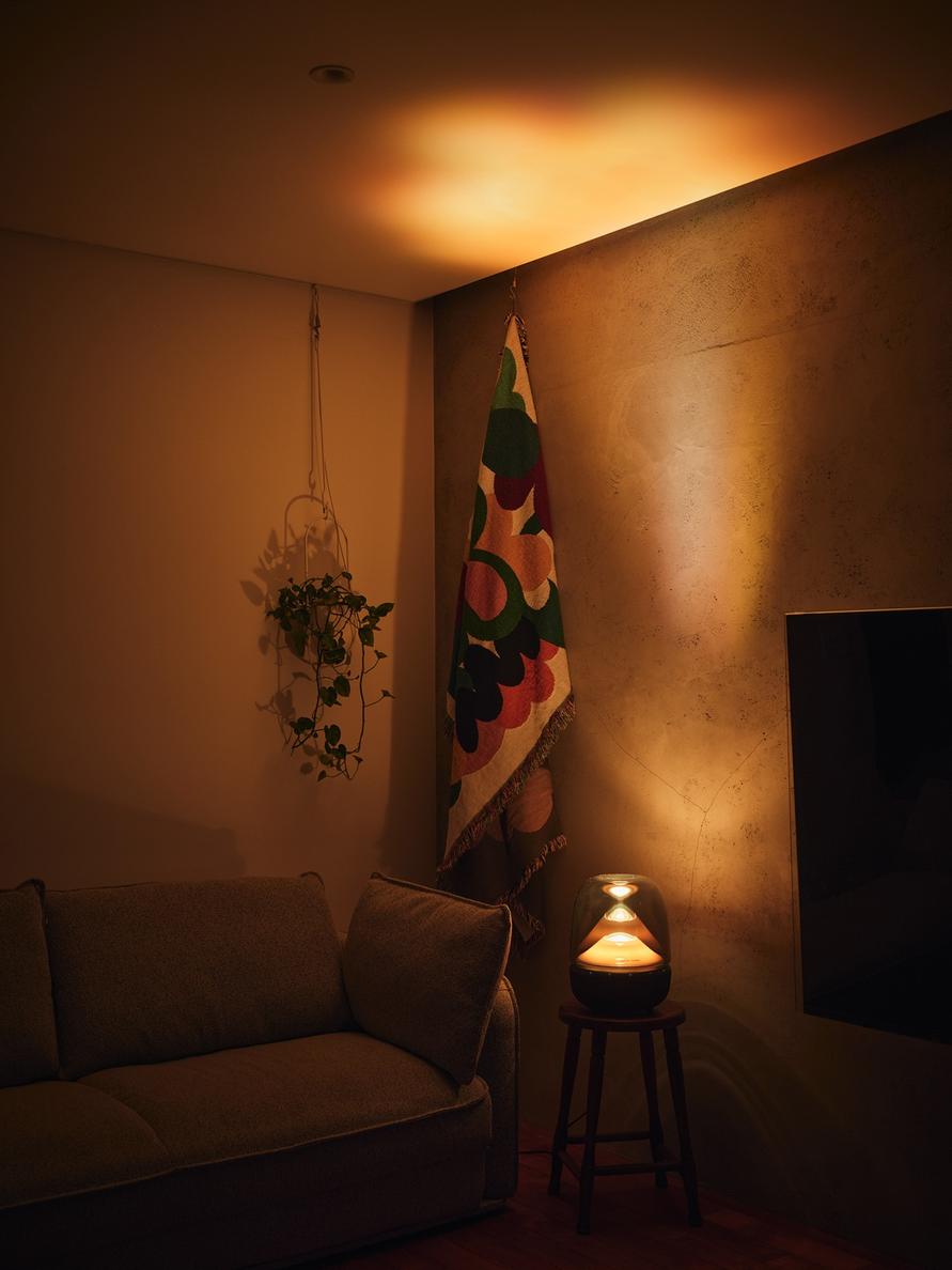 ライティングテーマの中では「ファイヤープレイス」がお気に入りだと話してくれた佐藤さんご夫妻ですが、その光に呼応するように、暖かな光を放つ「Aura Studio 5」からは、同時に薪が爆ぜるようなパチパチという音も流れていました。そう、これもまた、部屋での過ごし方を心地よくしてくれる機能のひとつ。