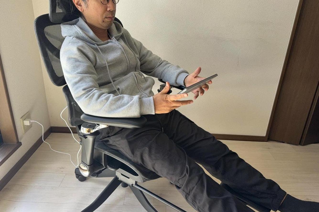次に試したのは、仕事以外のリラックス性能。このチェアは最大145°のリクライニングと収納式フットレスト、そして自由自在に動く「9Dメカ式アームレスト」を備えています。リクライニングを軽めに倒し、アームレストを内側に寄せて角度をつけた「リラックスモード」で1時間過ごしてみました。
