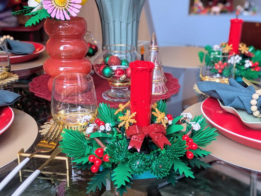 ダイニングテーブルの上には「レゴ(R)クリスマステーブルデコレーション」がさりげなく並び、テーブルウェアとも好相性。